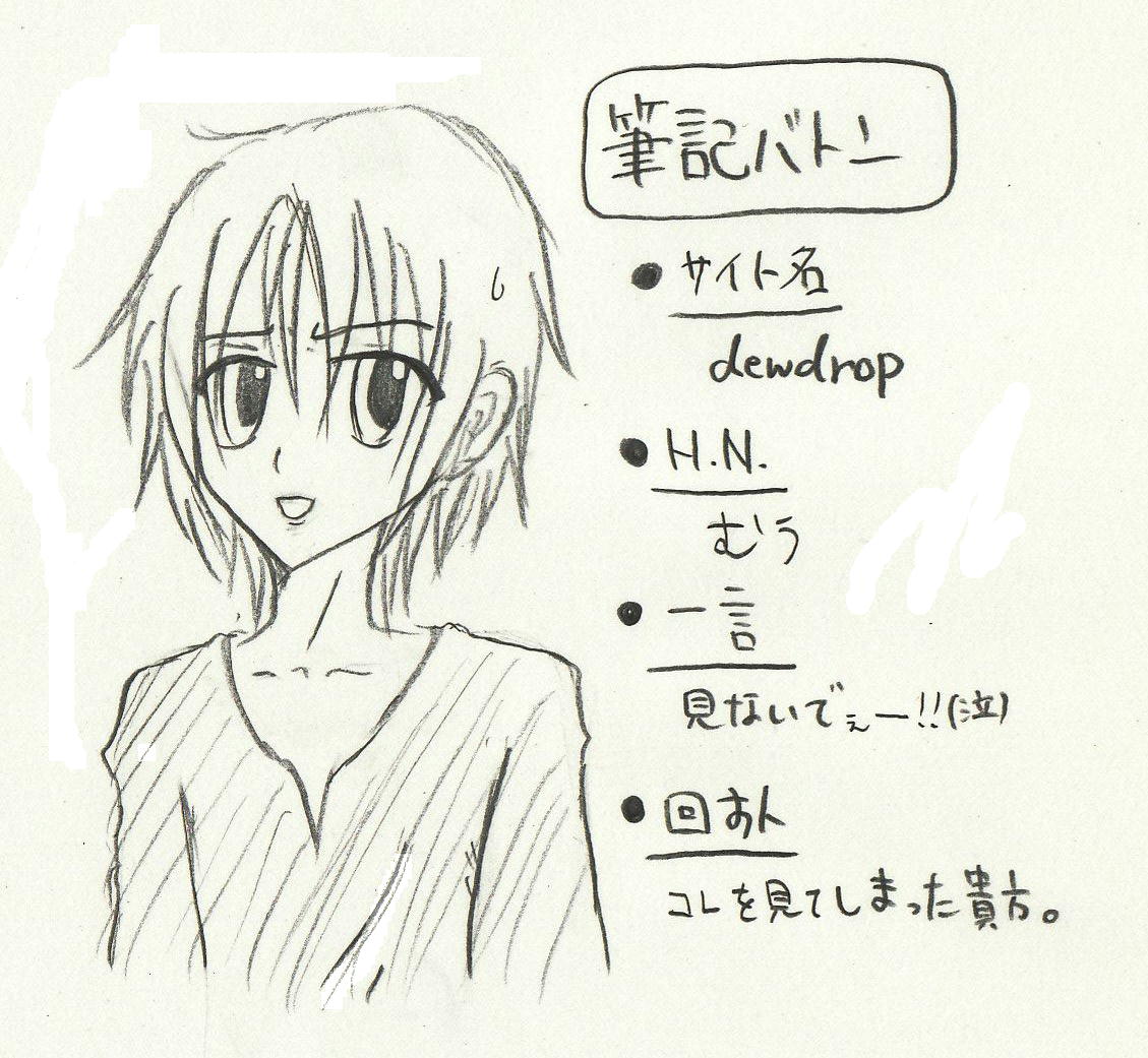 このバトン、最初はどうやって答えるのか分からなかったんですが、どうやら上の項目を自分(筆記)で書き、なおかつイラストも入れたら出来上がり…だそうです。っていうか、何故イラスト的バトンをむうに強制で回すのだ…!!(泣)